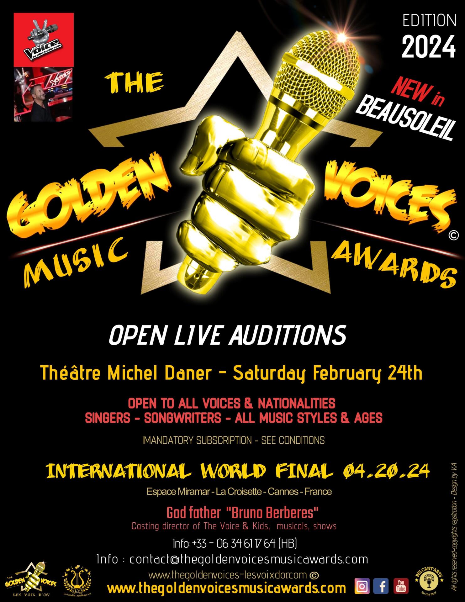 Do not miss this annual professional springboard, with rare career opportunities before a jury of professionals sponsored by 'Bruno Berberes', casting director of The Voice & Kids, Musicals and various shows, surrounded by a jury of professionals emeritus. A unique opportunity to join the *MONACO TEAM* set to represent MONACO at the next annual international world final on April 20, 2024 on the famous Croisette de Cannes.