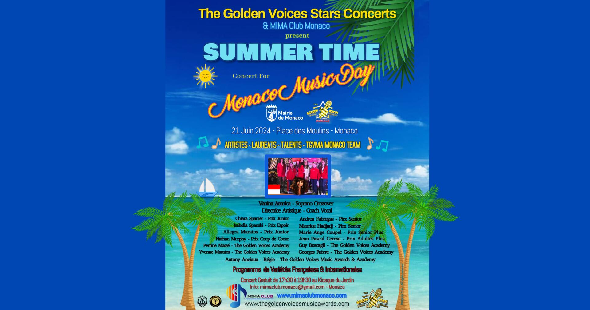 SUMMERTIME concert as part of World Music Day on 21 June 2024, on the Place des Moulins, featuring the best of French and international music thanks to our exclusive partnership with The Golden Voices Music Awards & Stars Concerts. "Team Monaco" will be well represented, with several talented and award-winning artists. A concert with singers all ages and every genre, for a unique musical journey. Come and sing along with us!