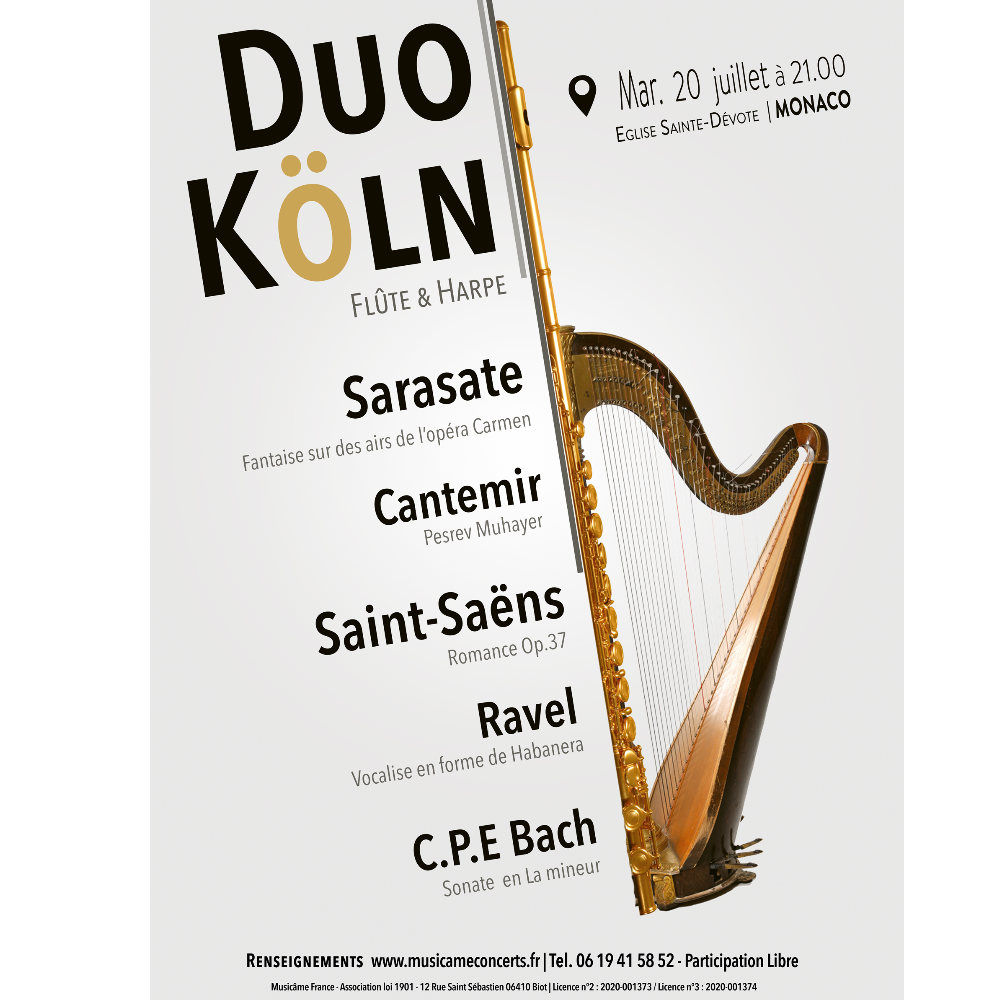 The Duo Köln is composed of musicians who enjoy playing chamber music while also performing as soloists. The breaking down of barriers between styles is one of our core values, as diversity in music conveys a message of peace to humanity. We warmly welcome you to share a moment of classical and world music. You are invited to enjoy a multicultural journey of contrasting sound worlds around an eclectic programme for flute & harp, which explores the masterpieces of western music including: Pablo de Sarasate's Fantasy on arias from Bizet's opera Carmen; a sonata by C. P.E. Bach; works by the composers Félix Godefroid, Béla Bartók and Maurice Ravel; the great traveller Camille Saint-Saëns and Nino Rota’s sonata, to whom we owe numerous film scores. We will also introduce you to the colourful sounds of Indian ragas and the music of the Ottoman Empire, Argentina and Japan with pieces by Moldavian-Ottoman prince Dimitrie Cantemir and composers of the likes of Astor Piazzolla and Michio Miyagi.
