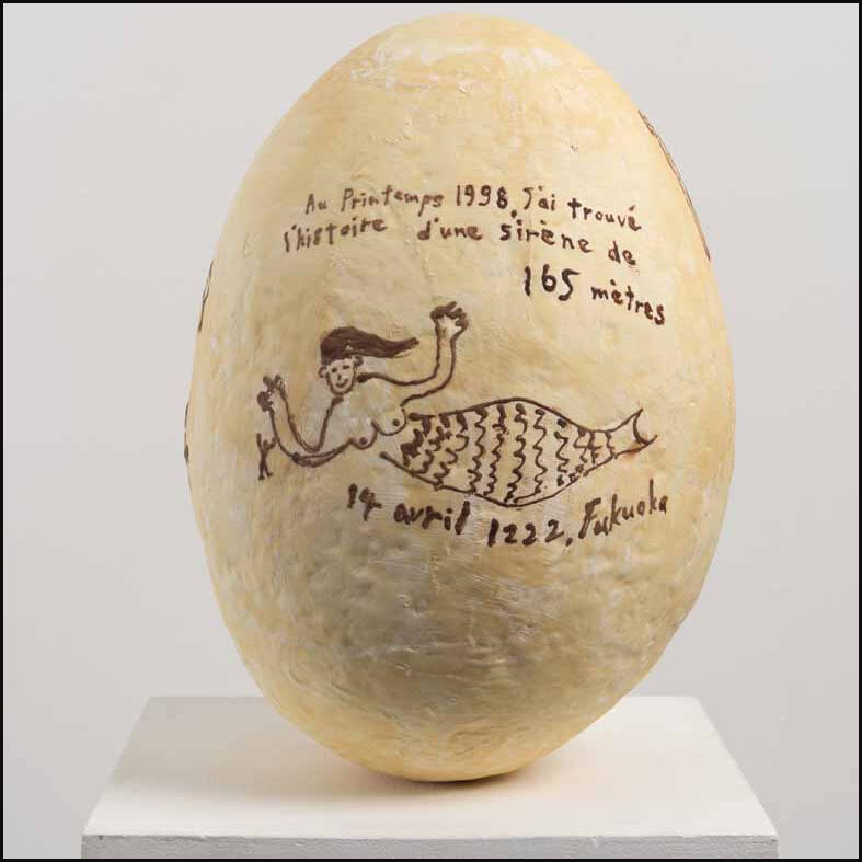 The exhibition is inspired by a Japanese medieval legend that tells the story of a mermaid, whose body measured 165 metres long, and who was washed ashore on a beach in Fukuoka, in southern Japan. The legend is the vehicle for the artist's creative process, combining installations, films, sculptures, photographs, and texts.