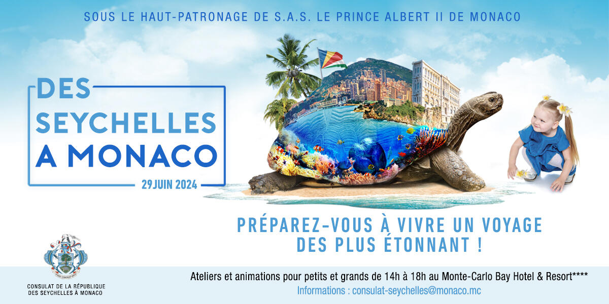 AN AFTERNOON OF IMMERSIVE ENTERTAINMENT. Seychelles' Honorary Consul in Monaco invites you to a celebration of Seychelles in the Mediterranean Garden of the Monte-Carlo Bay Hotel & Resort, on Saturday 29 June 2024 from 2 pm to 6 pm. Discover the islands' beauty and treasures, and learn about the importance of protecting our environment with a series of activities open to all, including arts and crafts, food tasting, eco-awareness and cultural exchanges for all ages 7 and over. Free admission.