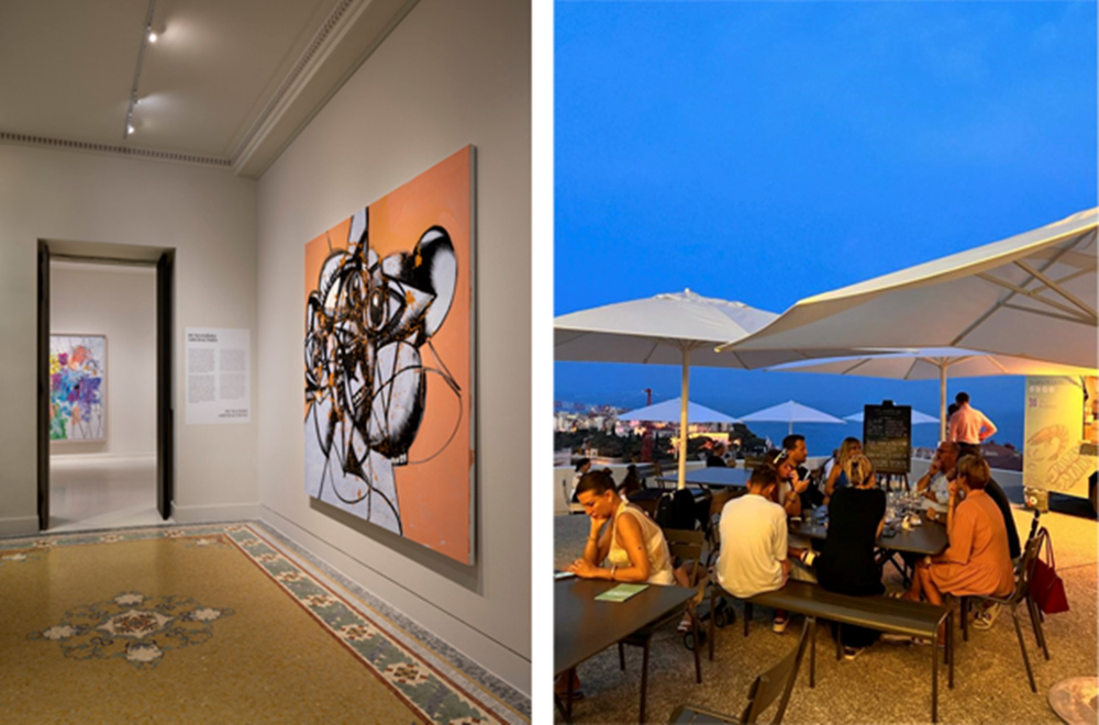 Photo : Gauche : vue de l'exposition « George Condo - Humanoïdes » à la Villa Paloma - Photo NMNM/Andrea Rossetti - droite : nocturne à la Villa Paloma