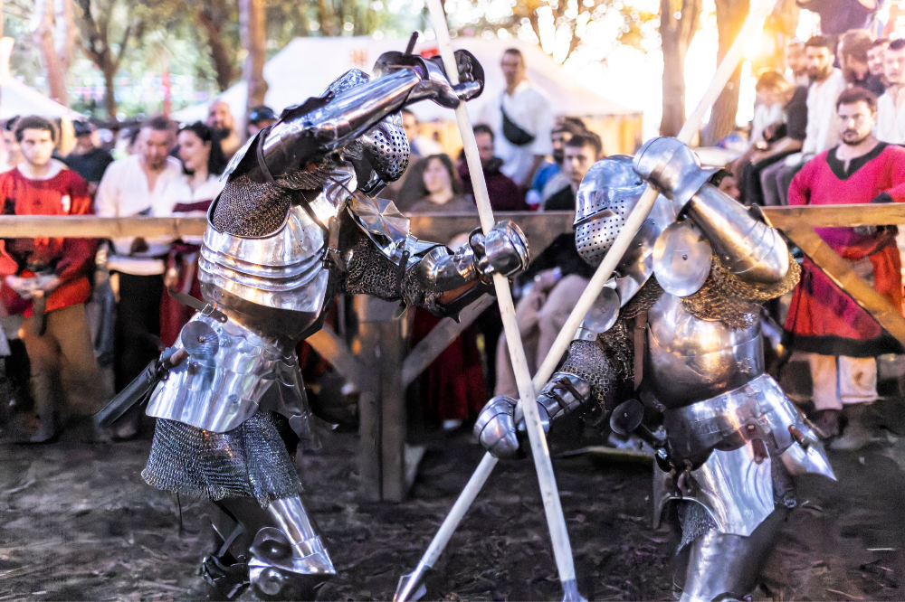 s’affrontent en armures historiquement fidèles avec des armes émoussées.