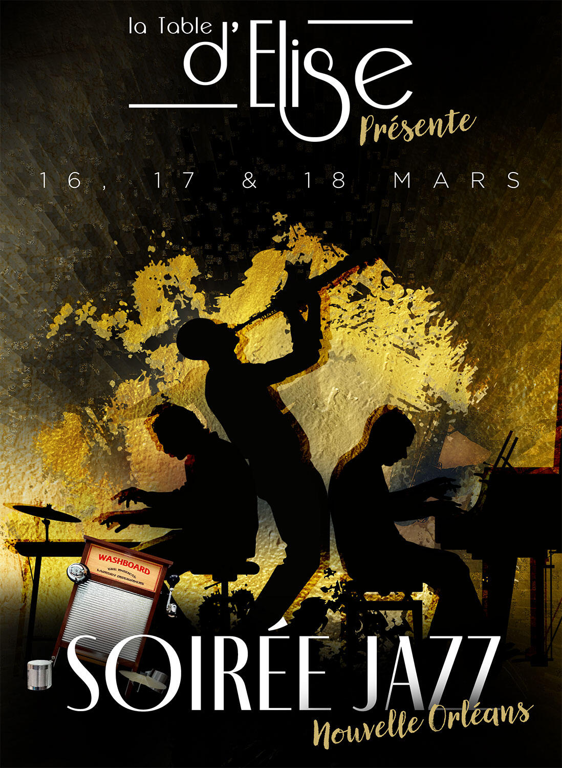 Nous avons le plaisir de vous annoncer les soirées Jazz New Orleans à ne pas manquer à La Table d'Elise les 16, 17 et 18 mars prochains ! Venez découvrir un spectacle où le "Trio Tonic" vous fera voyager et swinger avec une énergie débordante. Vous y découvrirez par ailleurs le washboard, un instrument de musique frotté apparu à La Nouvelle-Orléans.