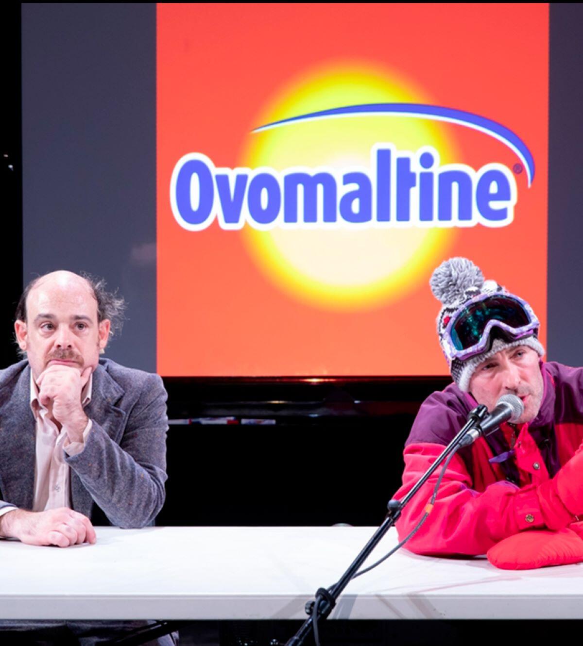 Une salle de conférences, joyeux capharnaüm de bric et de broc : deux drôles de zèbres se targuent de mille qualités, tour à tour champion de ski ou psychanalyste, buveur ou “terminateur de spectacle”, mais toujours sur le même modèle vingt fois décliné : “mon métier consiste à… ”. Ils alignent avec fierté et ridicule autant d’autoportraits burlesques de “métiers d’homme” et trébuchent depuis le piédestal de leur mégalomanie.