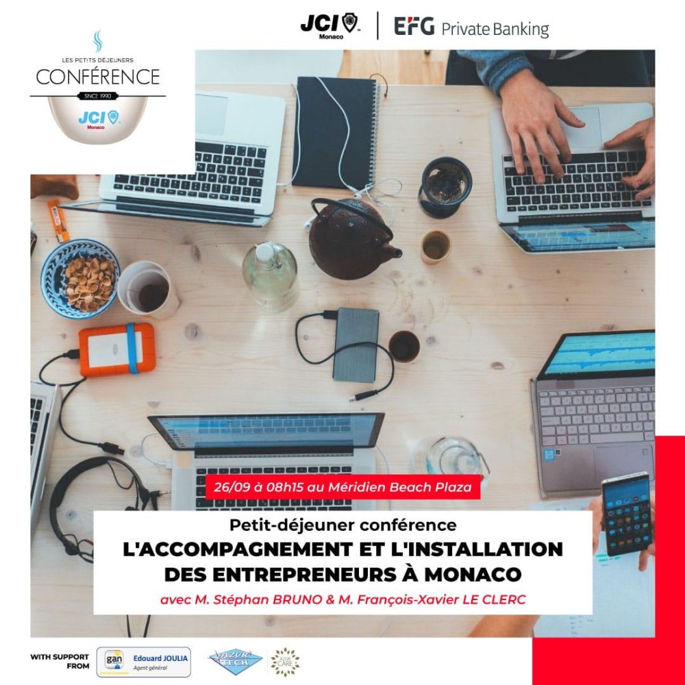 La commission des Petits-Déjeuners Conférences de la JCEM a le plaisir de convier les résidents et actifs de la Principauté le temps d’un petit-déjeuner, dans un esprit de partage et d'échange, lors duquel nous aurons l’honneur d’accueillir Monsieur Stéphan BRUNO, Directeur de la Direction du Développement Économique ainsi que Monsieur François-Xavier LE CLERC, Chef de Division à la Division du Financement et Développement de l'Économie.