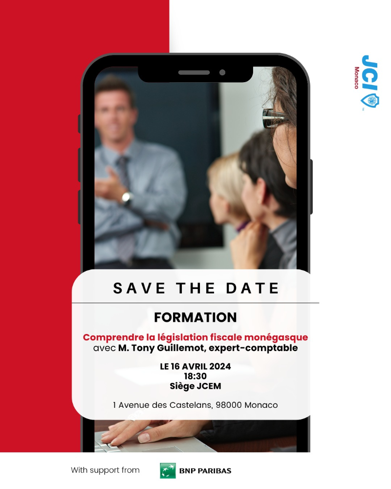 Rendez-vous le Mardi 16 Avril 2024 à 18h30 au sein du siège de la Jeune Chambre Économique de Monaco (JCEM) pour notre 4ème formation : “Comprendre la législation fiscale monégasque”